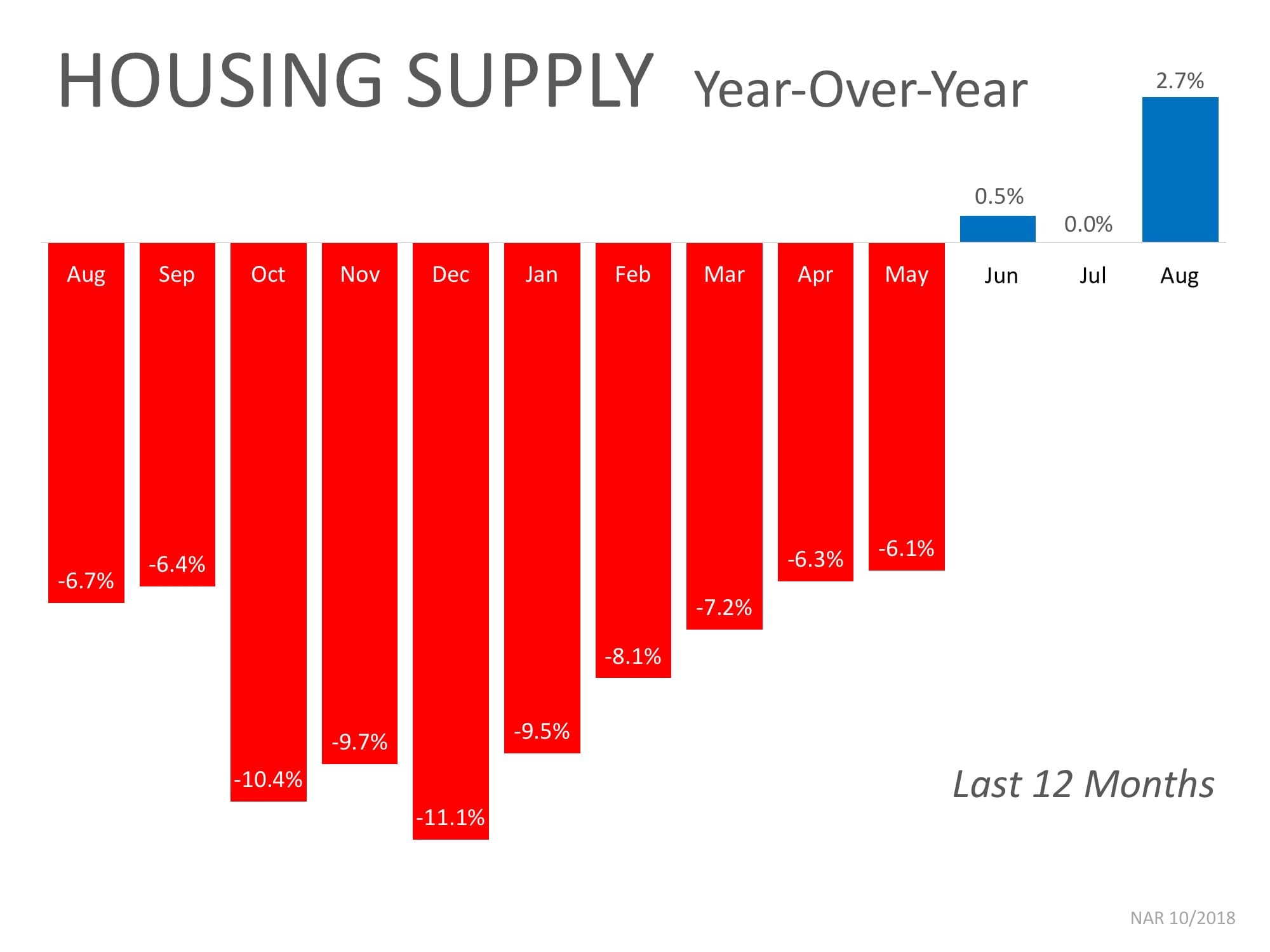 The chart below shows the change in housing supply over the last 12 months compared to the previous 12 months. As you can see, in June, July, and August, inventory levels have started to increase as compared to the same time last year.