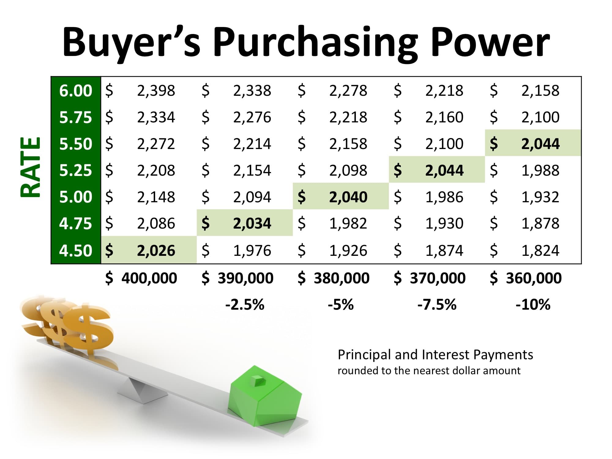 Purchasing power, simply put, is the amount of home you can afford to buy for the budget you have available to spend. As rates increase, the price of the house you can afford to buy will decrease if you plan to stay within a certain monthly housing budget.